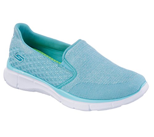 Make a statement in sporty casual comfort with the SKECHERS Equalizer. Soft one piece knit fabric upper in a slip on sporty casual comfort walking sneaker with textured detail and Air Cooled Memory Foam insole. Stitching accents. Stitched fabric edging trim. Color accented interwoven fabric front panel. Side panels feature textured diamond-pattern design. Side S logo. Dual side elastic fabric panels for easy slip on fit. Padded collar. Soft fabric shoe lining. Air Cooled Memory Foam cushioned comfort insole. Dual-Lite shock absorbing dual density lightweight midsole. 1 1/4 inch built in heel. Super flexible traction outsole.